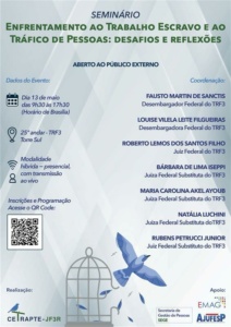 A Comissão de Enfrentamento ao Tráfico de Pessoas e Trabalho Escravo da Justiça Federal da 3ª Região, coordenada pelo desembargador federal Fausto Martin de Sanctis, promove o seminário “Enfrentamento ao trabalho escravo e ao tráfico de pessoas: desafios e reflexões”.