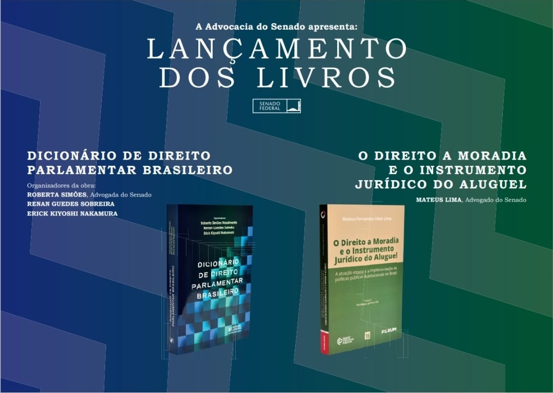A Advocacia do Senado lançará, no próximo dia 28, os livros O Direito a Moradia e o Instrumento Jurídico do Aluguel, de autoria de Mateus Lima, e Dicionário de Direito Parlamentar Brasileiro, de Roberta Simões, Renan Guedes Sobreira e Erick Kiyoshi Nakamura.