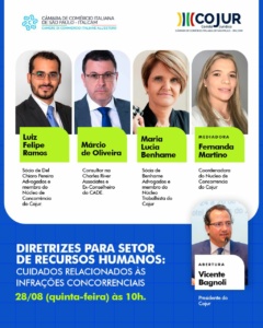 A Câmara de Comércio Italiana de São Paulo (Italcam), por meio do seu Comitê Jurídico (Cojur), promove na quinta-feira (28/8), às 10h, o evento online “Diretrizes para setor de recursos humanos: cuidados relacionados às infrações concorrenciais”.
