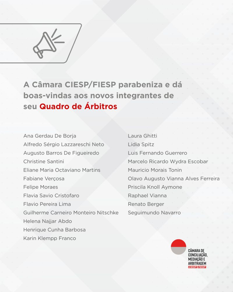 A Câmara de Conciliação, Mediação e Arbitragem Ciesp/Fiesp anunciou a aprovação de novos integrantes para o seu quadro de árbitros.
