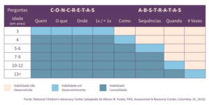 Além disso, o próprio Protocolo Brasileiro de Entrevista Forense (PBEF) possui um anexo III intitulado Guia Prático de Perguntas Apropriadas ao Nível de Desenvolvimento (págs. 70/71), que demonstra que a capacidade de entendimento das perguntas e evocação da memória varia conforme o tipo de cada questionamento e de acordo com a idade da criança, o que constitui um padrão genérico, mas não rígido. Se não, vejamos: