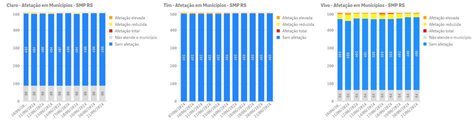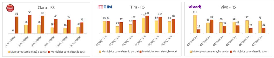 Na oportunidade, a Agência Nacional de Telecomunicações (Anatel) disponibilizou painel público com informações a respeito da afetação nas redes de telefonia móvel das prestadores de serviços Claro, Tim e Vivo, nos municípios gaúchos, veja-se: