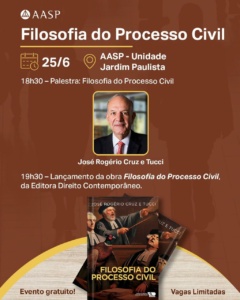 O lançamento de Filosofia do Processo Civil terá palestra de Tucci sobre a obra. O evento, gratuito, começará às 18h30 na unidade Jardim Paulista da Aasp, que fica na Alameda Santos, 2.159, 15º andar.