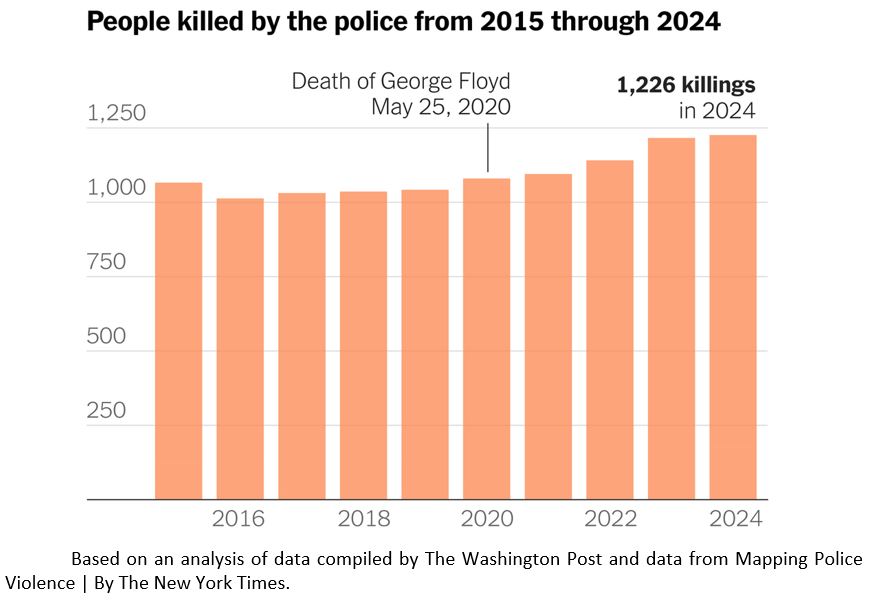 As mortes por policiais giravam em torno de 1.000 em 2019 e chegaram a 2024 com o número crescente de 1226; ou seja, mais de 20% de aumento em cinco anos, segundo o mapa de violência policial compilado pelo Washington Post e divulgado pelo Jornal New York Times[3].