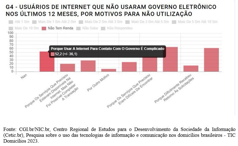 Segundo dados do Instituto Brasileiro de Geografia e Estatística (IBGE), de 2022 a 2023, cerca de 59 milhões de brasileiros vivem com renda domiciliar per capita abaixo da linha de pobreza. Mesmo considerando a hipótese de que todos tenham acesso à internet e a dispositivos tecnológicos que permitam o uso de serviços de governo eletrônico, estima-se que aproximadamente 30 milhões dessas pessoas ainda deixariam de utilizar plataformas digitais, como o sistema/app Meu INSS, por acharem difícil ou complicado o uso da internet para se comunicar com o governo, conforme indicado no gráfico abaixo.
