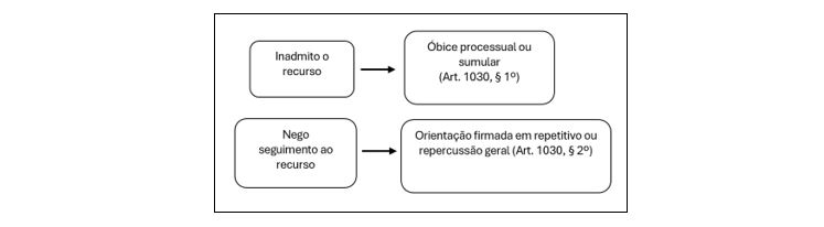 Aqui é importante fazer uma distinção terminológica. No juízo de conhecimento a quo, os tribunais utilizam as expressões “inadmitido o recurso”, quando o fundamento para impedir a tramitação do recurso é amparado em algum impedimento formal, como a Súmula 07/STJ ou Súmula 83/STJ e “nego seguimento ao recurso”, se o fundamento for baseado em alguma orientação firmada em sede de repercussão geral ou recurso repetitivo (artigo 1030, inciso I, alínea b do CPC).