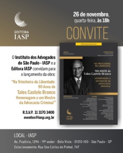 A editora do Instituto dos Advogados de São Paulo (Iasp) lança, em 26 de novembro, o livro Trincheira da liberdade: 90 anos de Tales Castelo Branco.