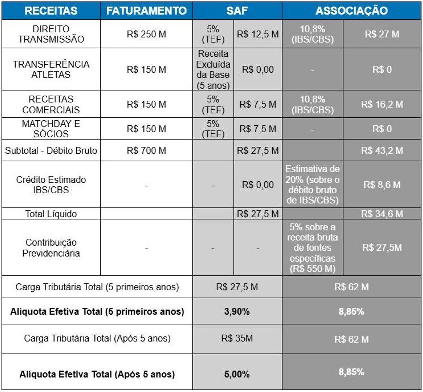 Um clube-associação com maior volume de transferências de atletas (receita imune), menores custos com autônomos e uma gestão fiscal altamente eficiente, capaz de maximizar o aproveitamento de créditos de IBS/CBS sobre seus insumos operacionais (marketing, custos de produção etc.), poderia reduzir sua alíquota efetiva e apresentar um resultado mais vantajoso. O cenário pode mudar, por exemplo, se o clube investir fortemente em infraestrutura, como um novo centro de treinamento, pois no modelo associativo, parte do IBS/CBS embutido nesses custos poderia ser recuperado como crédito, algo vedado à SAF.