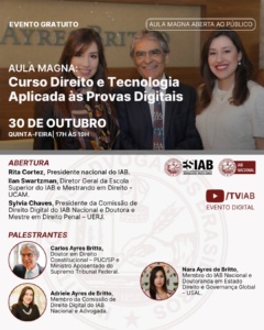 Os interessados poderão conhecer a proposta do curso na aula magna gratuita, que acontecerá nesta quinta-feira (30/10), às 17h, com transmissão pelo canal TVIAB no YouTube. Na ocasião, os juristas da família Ayres Britto farão palestras sobre o tema. Além do ministro aposentado do STF, participarão a membro da Comissão de Direito Digital do IAB Adriele Ayres de Britto e a doutoranda em Estado, Direito e Governança Global pela Universidade de Salamanca (USAL) Nara Ayres de Britto.