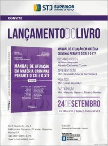 O livro Manual de atuação em matéria criminal perante o STJ e o STF (Editora Sobredito) será lançado na próxima quarta-feira (24/9), das 18h às 21h, no Espaço Cultural do Superior Tribunal de Justiça, em Brasília.